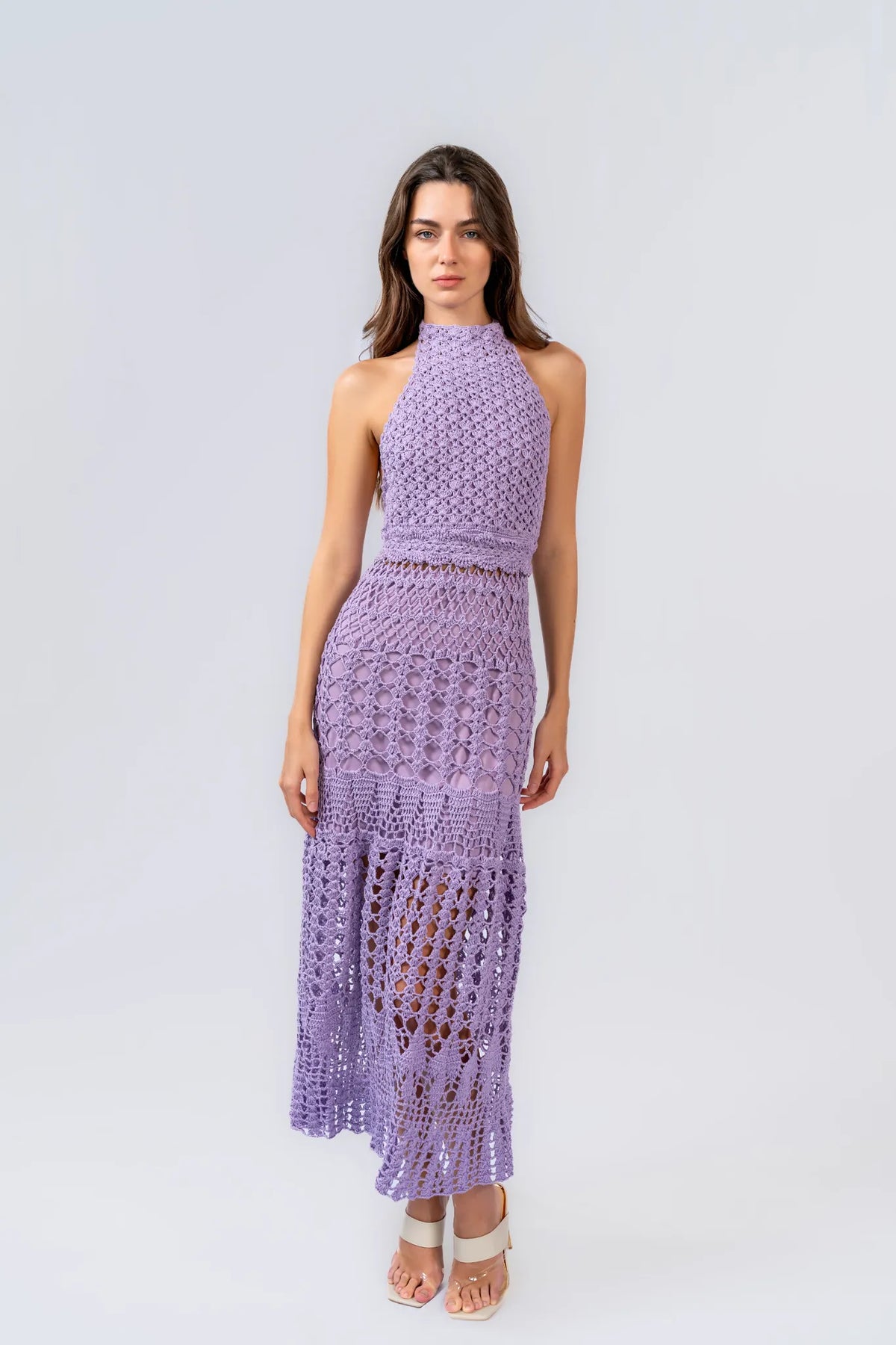 The piece has a built-in lining in the bust area and comes with a lined mini skirt in the same color, preserving the beauty of transparency without compromising elegance. To complete the look, a crochet belt—made with the same artisanal delicacy—accompany the dress, adding a touch of sophistication and versatility to the style.