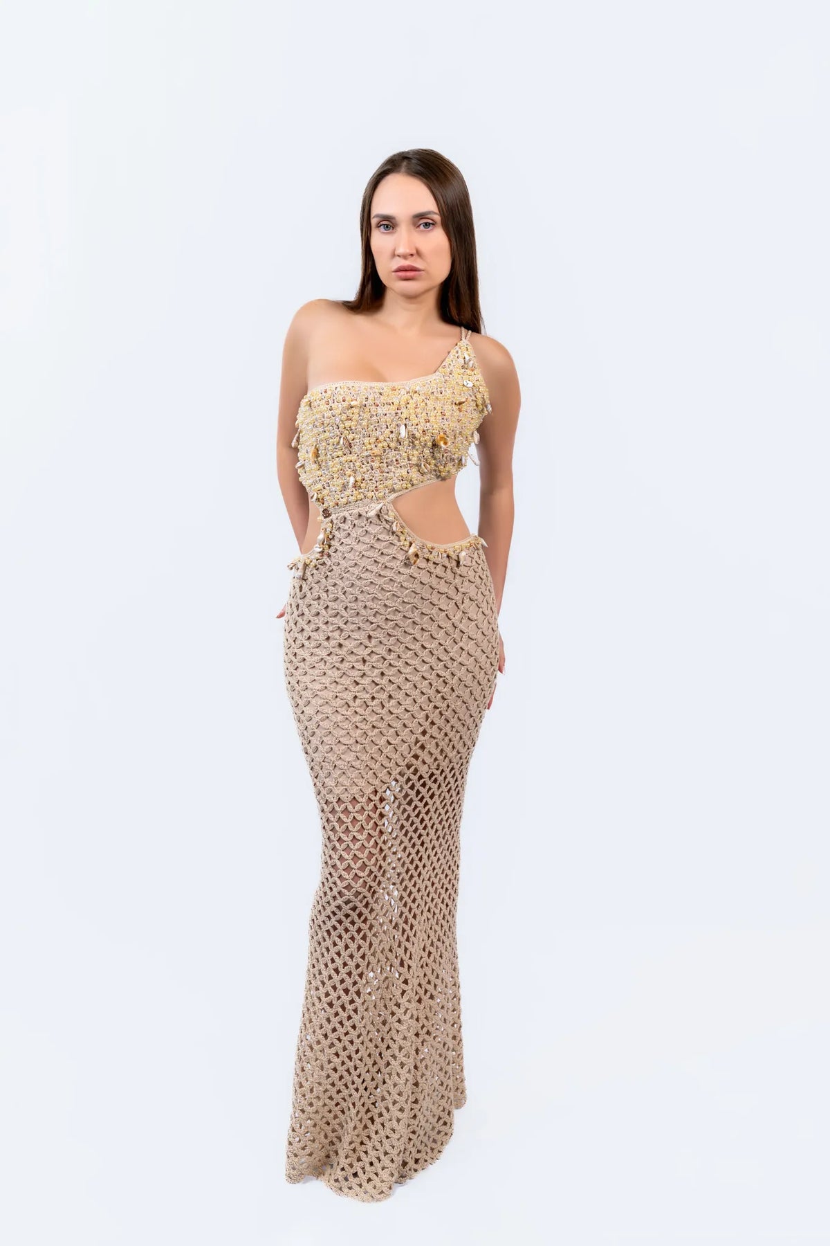 Delicate as a collection of sea treasures and striking as a living work of art, the Shell Path dress is made for women who leave their mark wherever they go.